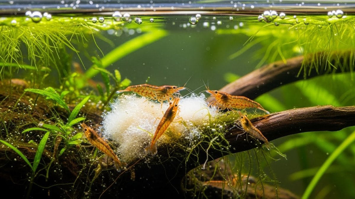 飼い主が与える餌が少ないと、エビは代わりに水カビや付着物をついばむ傾向があります。量が多いとそちらに集中するため、水カビへの興味は薄れます。