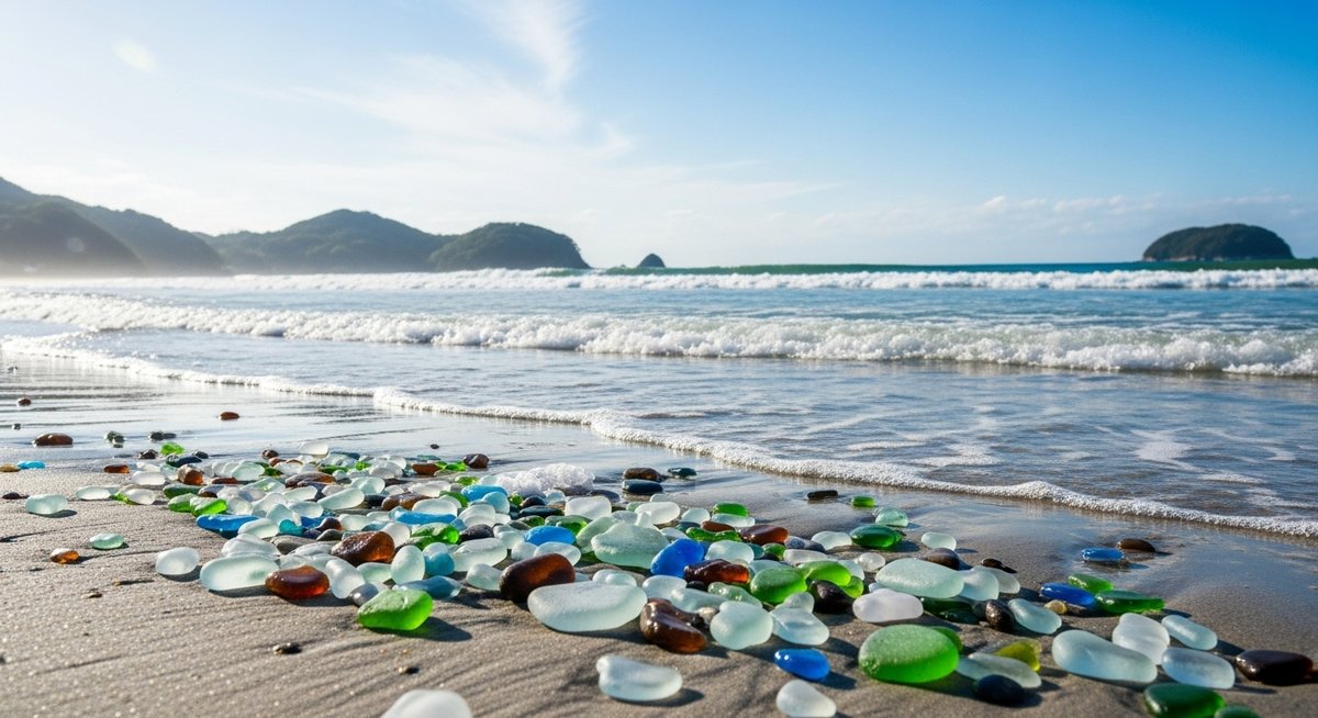 長崎県大村市には「ガラスの砂浜」として知られる場所があり、多彩な色のシーグラスが見つかります。湾に囲まれた地形が海流を穏やかにし、小さなガラス片が集まりやすい環境です。