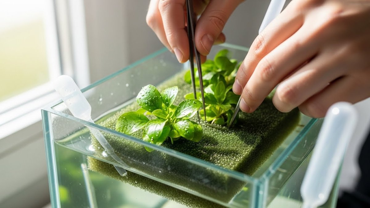 最初の数日は照明を通常より少し弱めにし、栄養ショックを避けます。もし光合成源(CO2や肥料)を強めにしている場合は一時的に調整してください。植え付け後は葉の状態やスポンジのずれを毎日チェックし、必要なら糸で補強します。